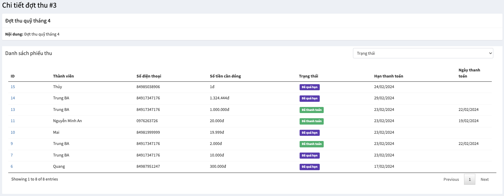 Chi tiết đợt thu sẽ hiển thị thông tin của đợt thu và danh sách các phiếu thu thuộc đợt thu này