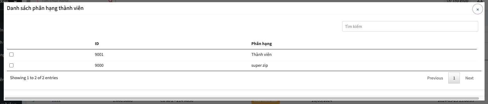 Ap dụng cho : Sẽ có 3 lựa chọn là Nhóm thành viên, Phân hạng thành viên, thành viên. Admin sẽ chọn 1 trong 3 và chọn "Tìm kiếm" ở bên dưới. Hệ thống sẽ hiển thị ra màn chọn danh sách theo loại mà admin chọn và admin tích chọn để thêm vào danh sách