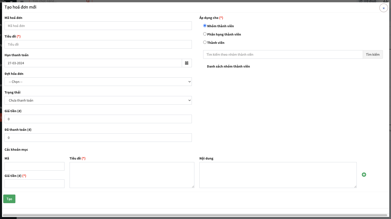 Các khoản mục: Phần này Admin sẽ liệt kế ra các khoản mà thành viên trong hội nhóm sẽ cần đóng trong phiếu thu này