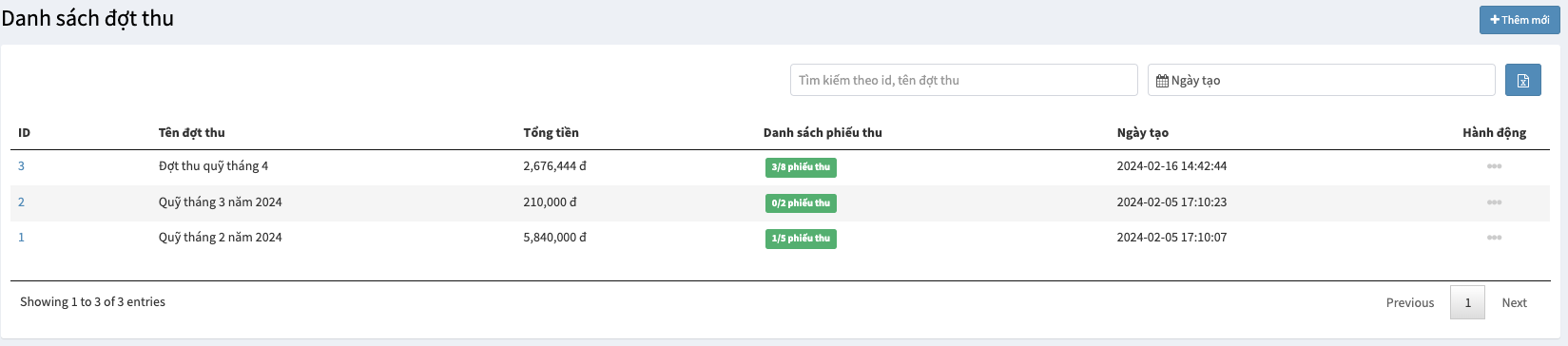 Danh sách đợt thu dùng để quản lý các phiếu thu theo từng đợt thu mà Admin tạo ra. Danh sách gồm có