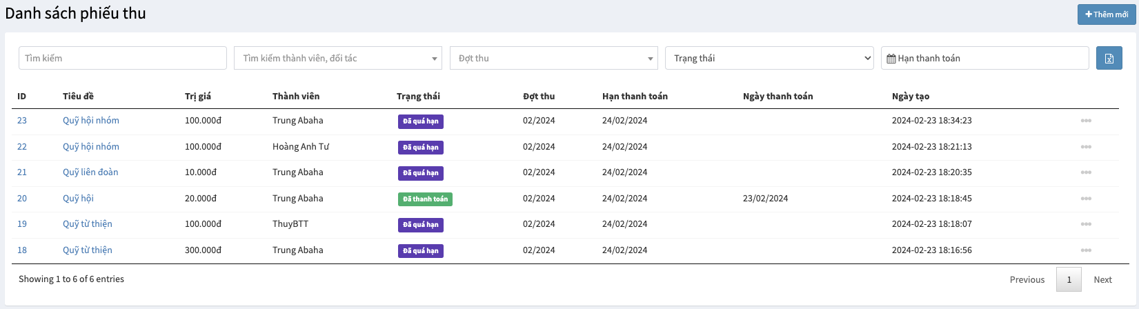 Phần danh sách phiếu thu dùng để quản lý các phiếu đóng quỹ của các thành viên trong hội nhóm