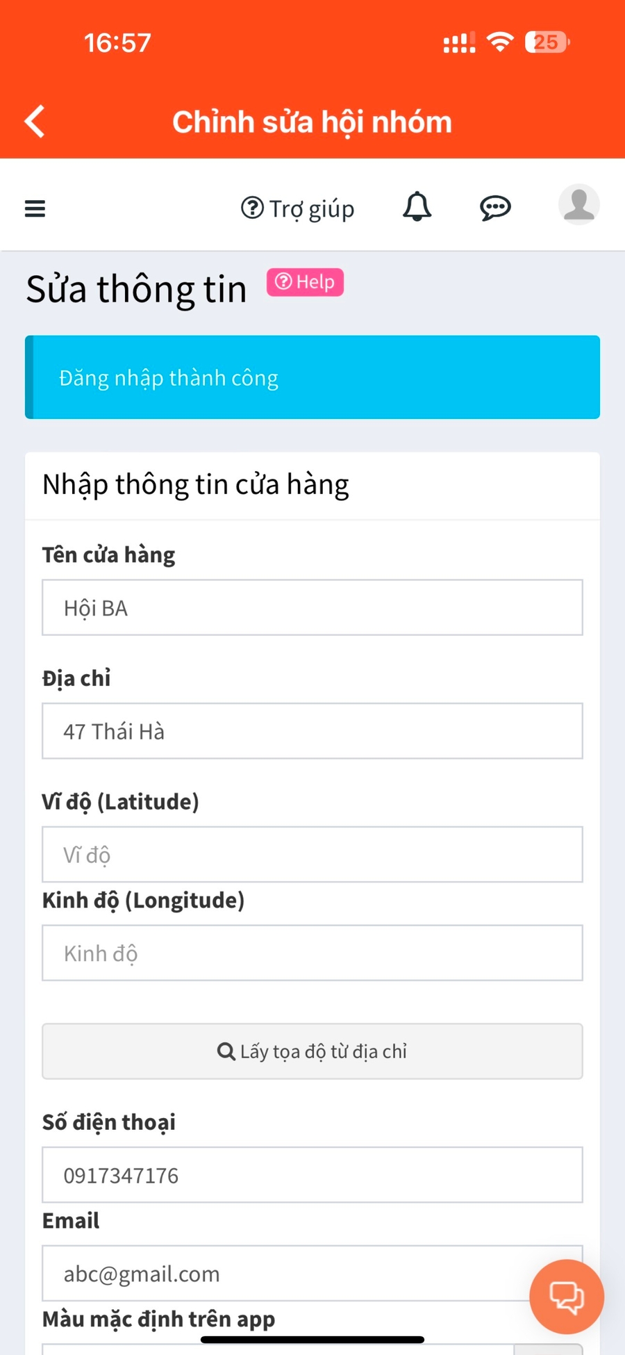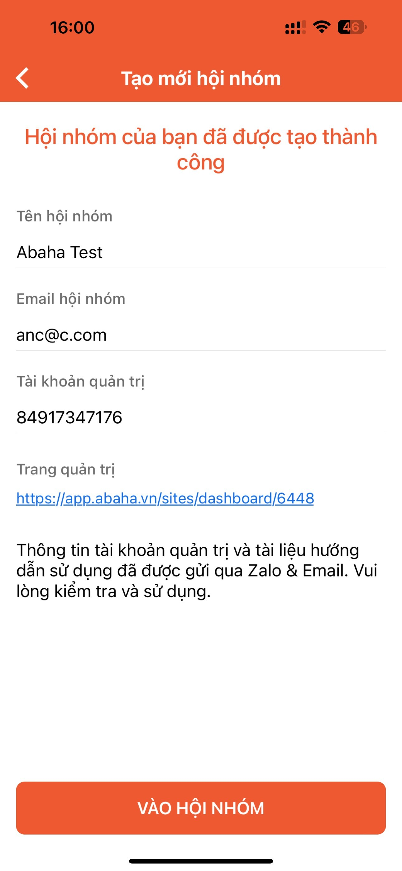 Khi tạo xong hội nhóm thì khách hang sẽ thấy màn thông báo thành công kèm các thông tin để đăng nhập và tài liệu hướng dẫn
