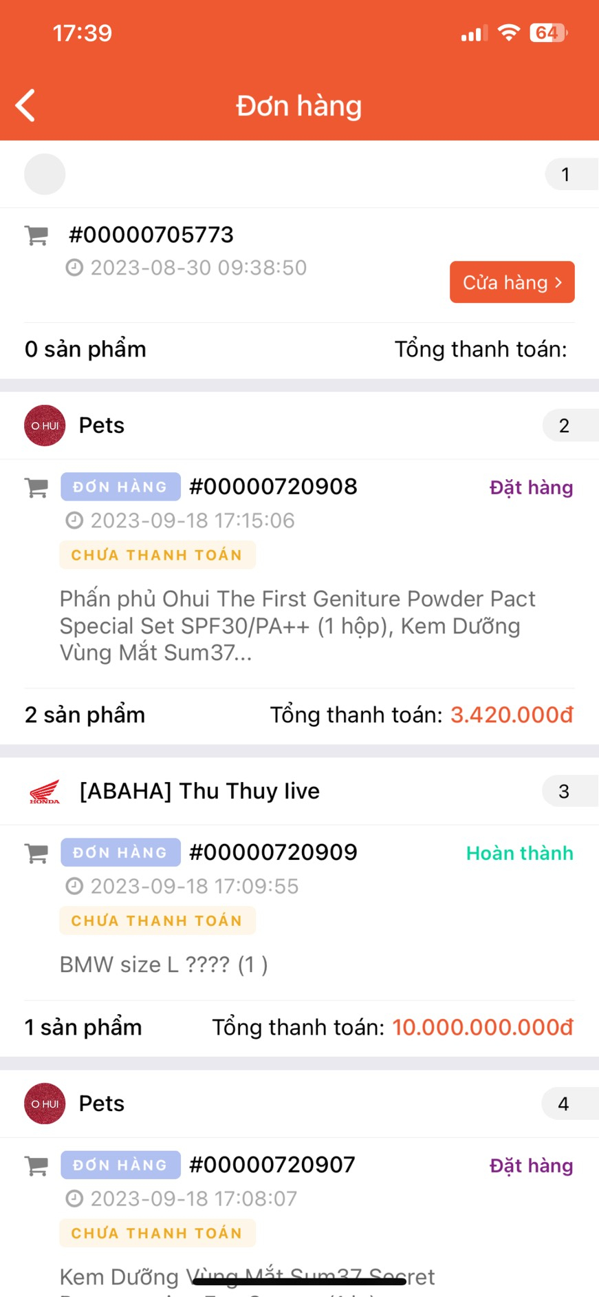 Danh sách đơn hàng hiển thị tất cả đơn hàng của bạn, sắp xếp từ mới đến cũ.