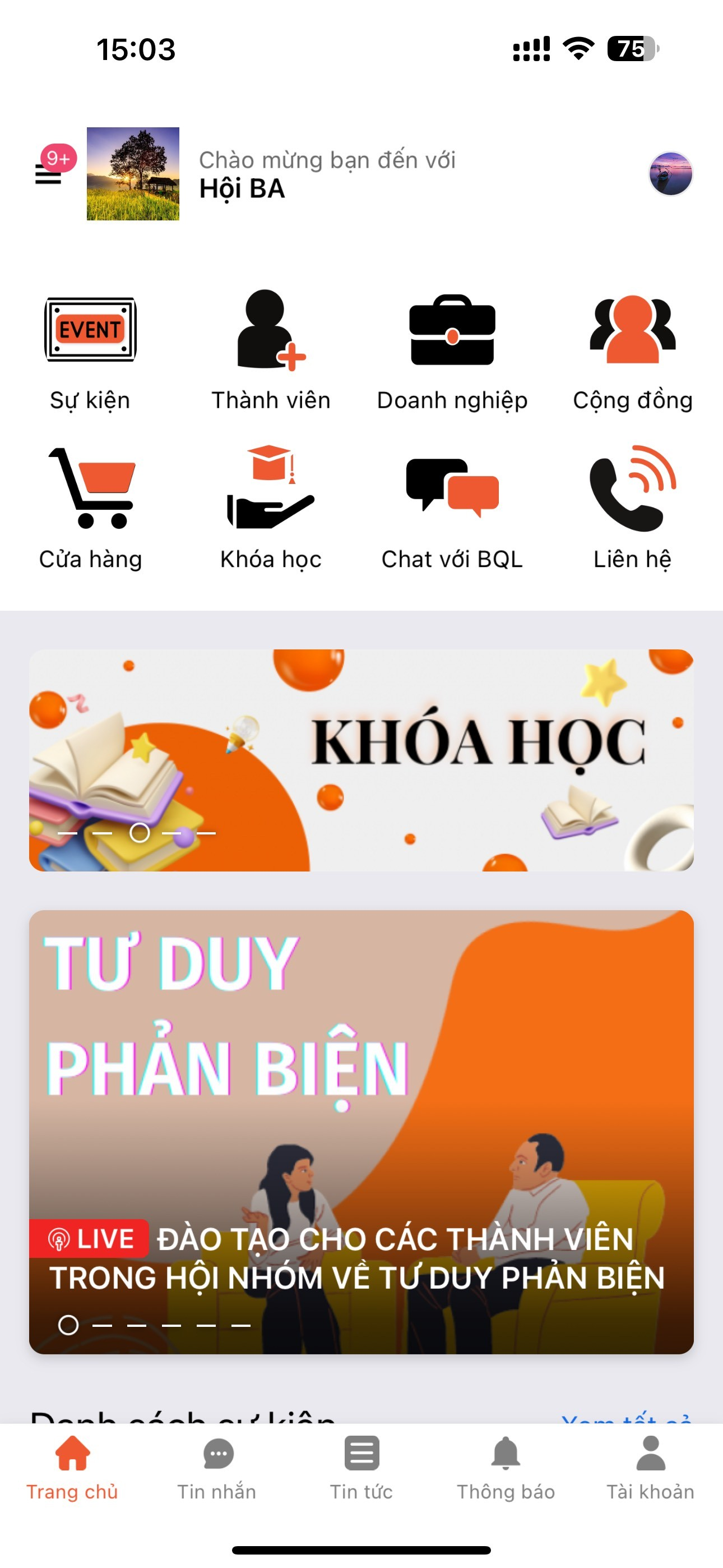 Trang chủ của 1 hội nhóm hiển thị tên và logo hội nhóm để thành viên có thể nhận biết được họ đang ở hội nhóm nào. Họ cũng có thể thay đổi hội nhóm bằng việc ấn vào icon 3 gạch nằm tại góc trái màn hình. Ngoài ra, user cũng có thể truy cập trang thông tin tài khoản bằng cách ấn vào avatar của user nằm đối diện góc phải màn hình.