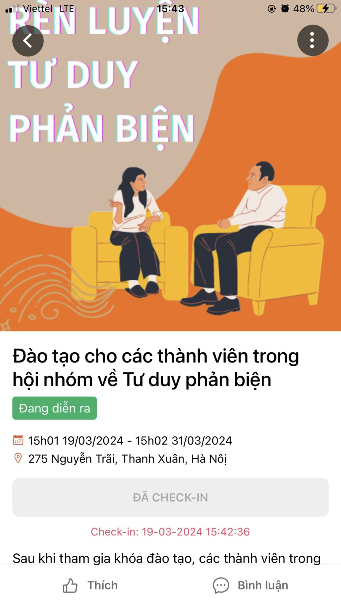 Màn hình chi tiết sự kiện khi thành viên đã CHECK-IN : hiển thị thêm thời gian mà người dùng đã check-in