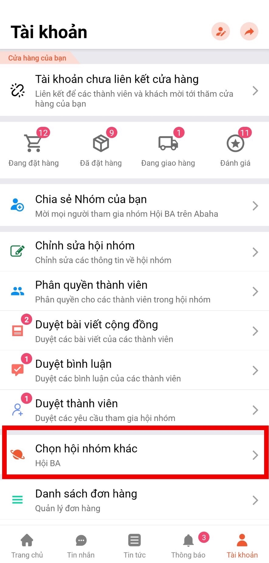Trang Danh sách đơn hàng quản lý tất cả các đơn hàng bạn đã đặt mua từ các cửa hàng của các thành viên trong hội nhóm. Để mở trang Danh sách đơn hàng bạn vào trang Tài khoản sau đó chọn mục "Danh sách đơn hàng". Ngoài ra bạn có thể theo dõi nhanh số liệu đơn hàng theo từng trạng thái, ấn vào từng trạng thái sẽ mở ra danh sách đơn hàng theo trạng thái đó.