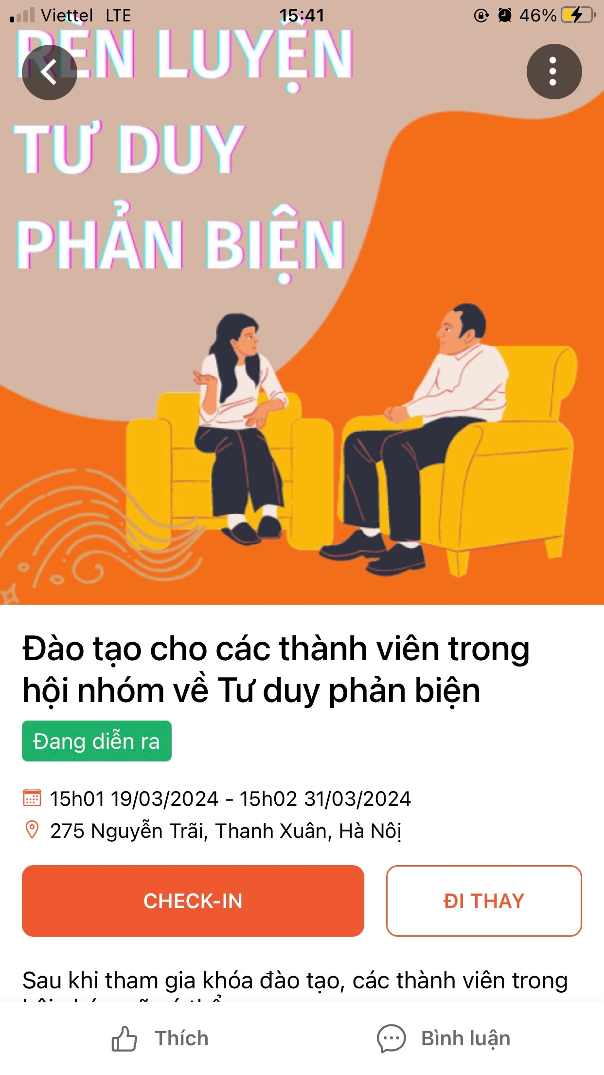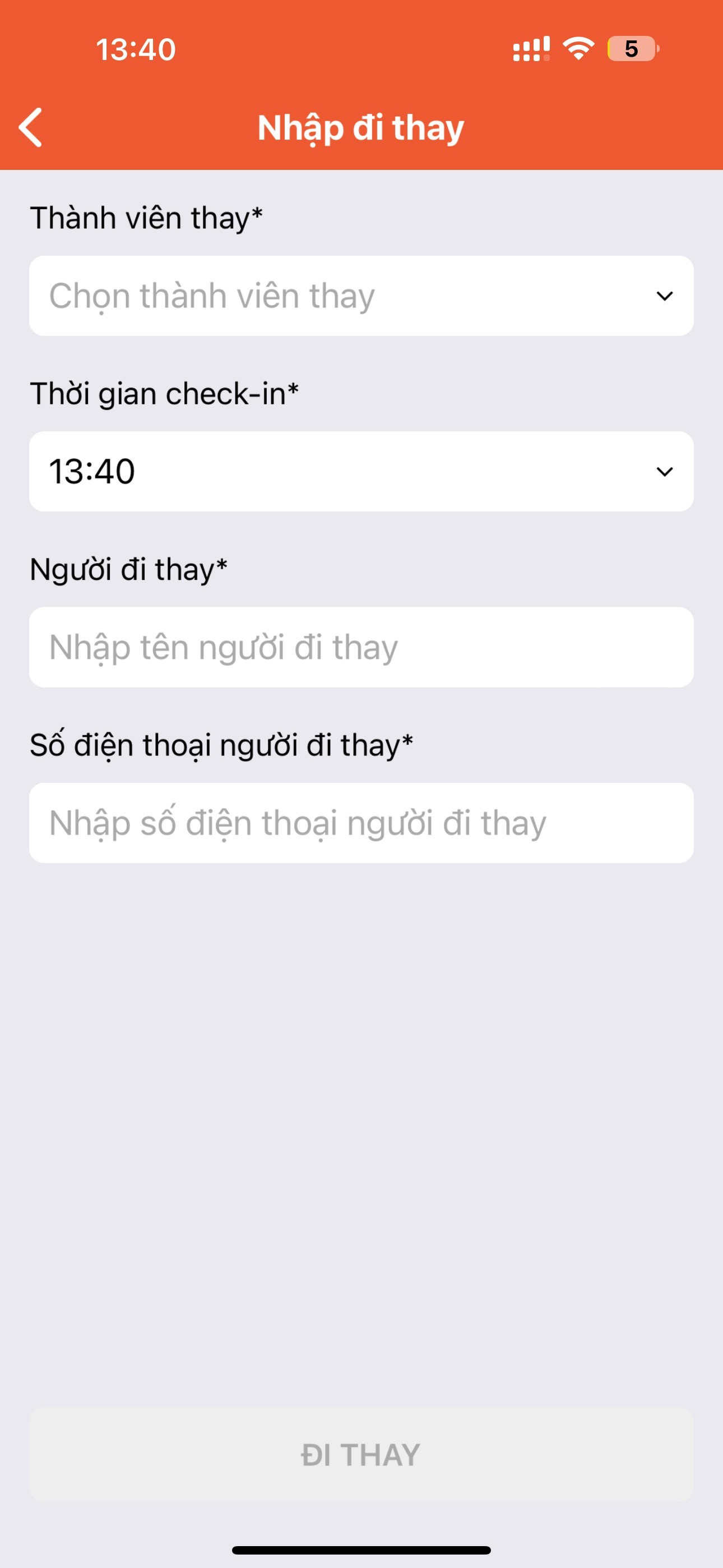 Màn hình chi tiết sự kiện khi thành viên chưa CHECK-IN và sự kiện này có cho phép đi thay