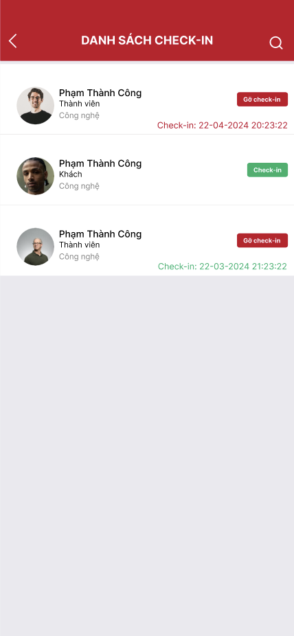 a) Hiển thị trên App: chức năng dành cho Admin giúp admin có thể check-in, quản lý các thành viên và khách mời.