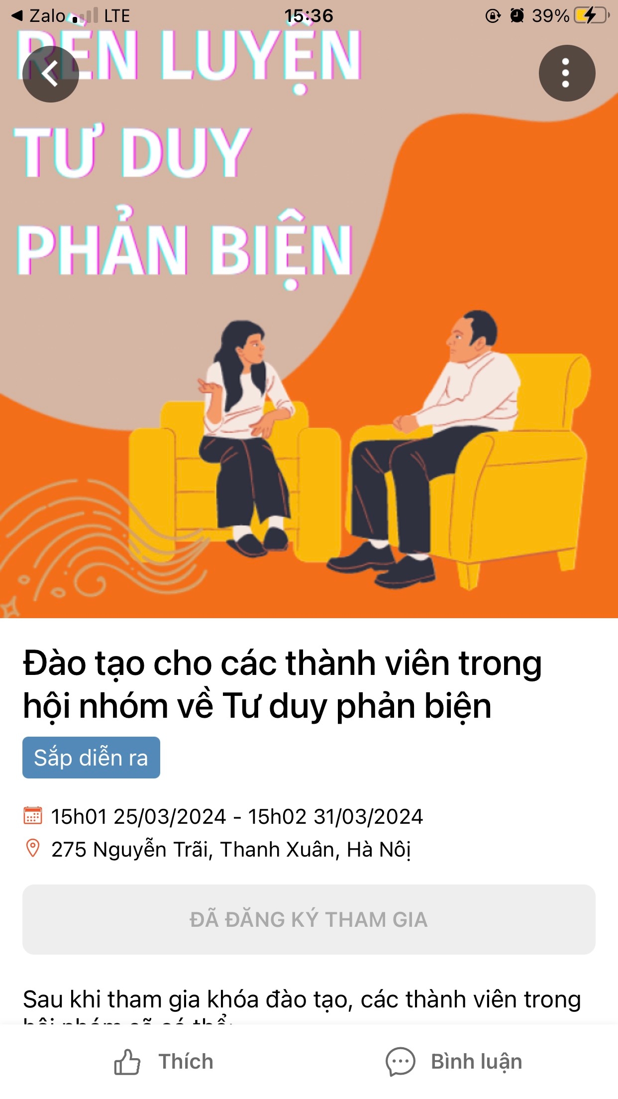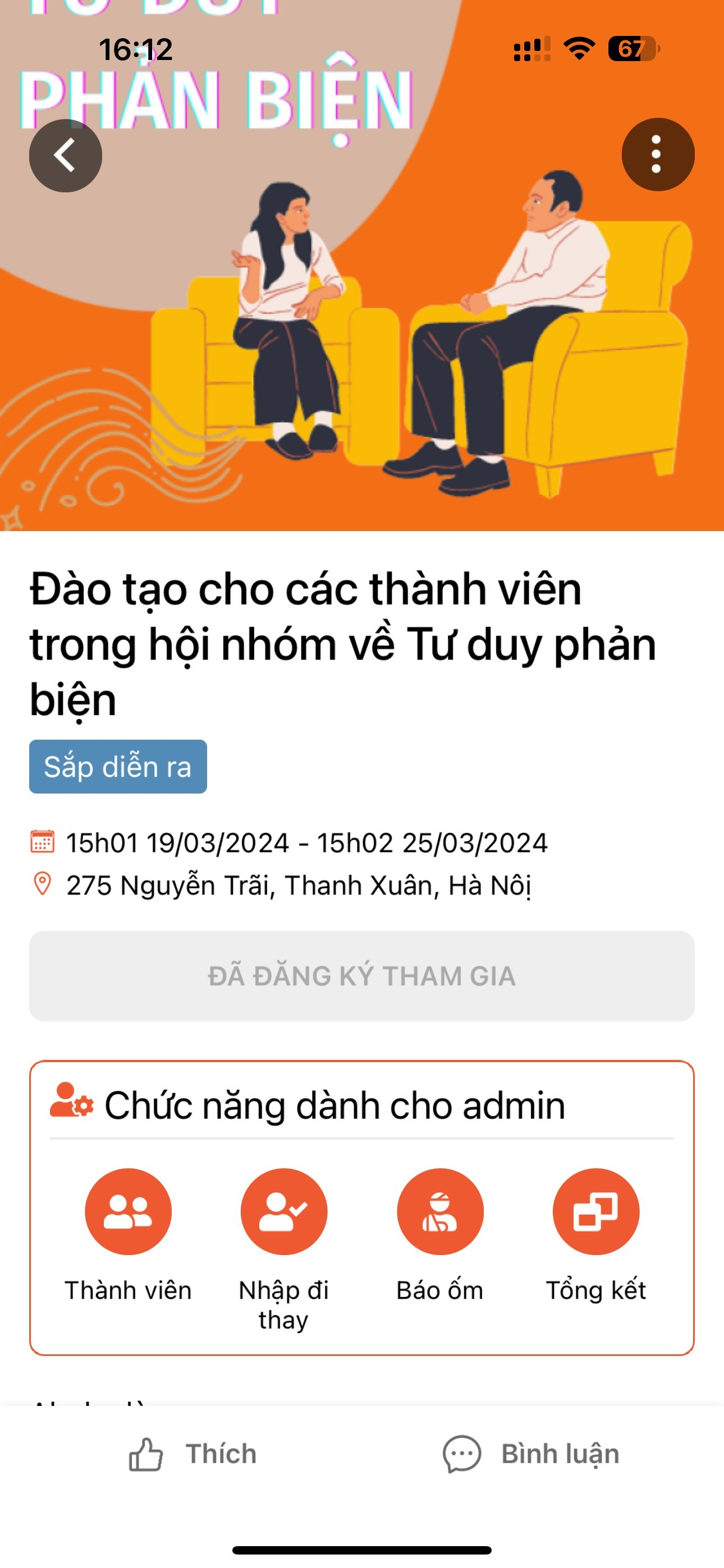 Màn hình chi tiết sự kiện khi thành viên đã Đăng ký tham gia