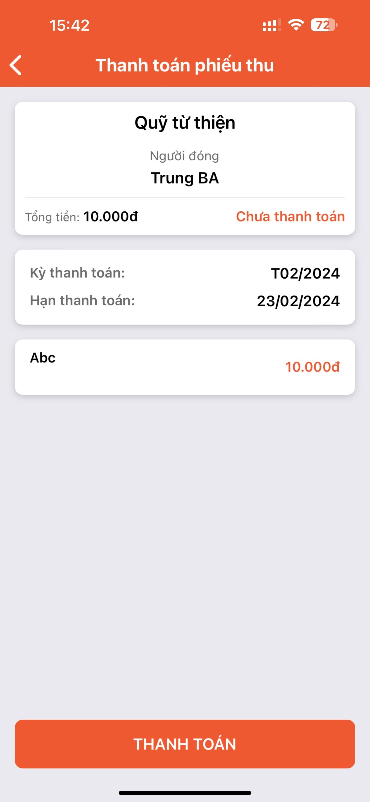Thanh toán; khi nhấn vào sẽ mở ra màn hình chi tiết về phiếu thu để thanh toán