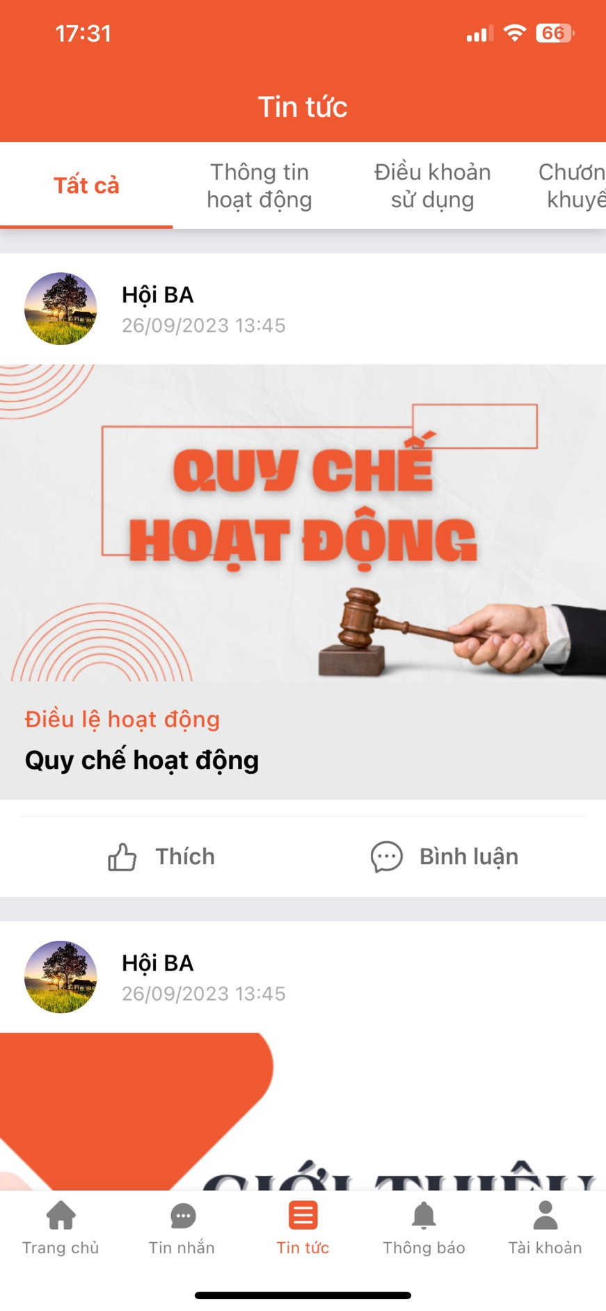 Trang Danh sách tin tức hiển thị tất cả các tin tức của hội nhóm, được chia thành nhiều tab. Mỗi tab tương ứng với 1 danh mục tin tức. Người dùng có thể like hoặc comment với từng tin tức họ đã đọc.