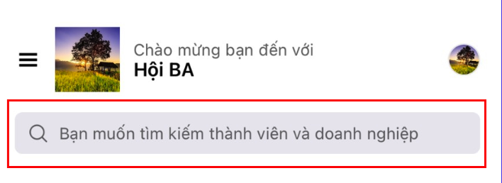 Để tìm kiếm thành viên hoặc doanh nghiệp trong hội nhóm bạn ấn vào ô tìm kiếm tại trang chủ. Sau đó nhập từ khoá muốn tìm kiếm. Hệ thống sẽ dựa theo từ khoá tìm kiếm để trả về kết quả thành viên và doanh nghiệp tương ứng.