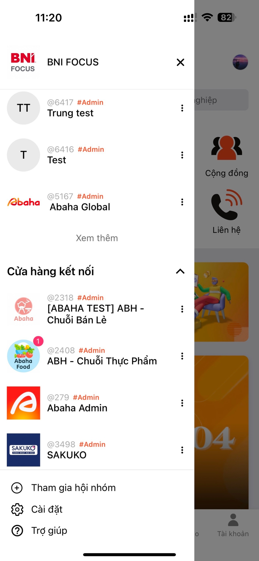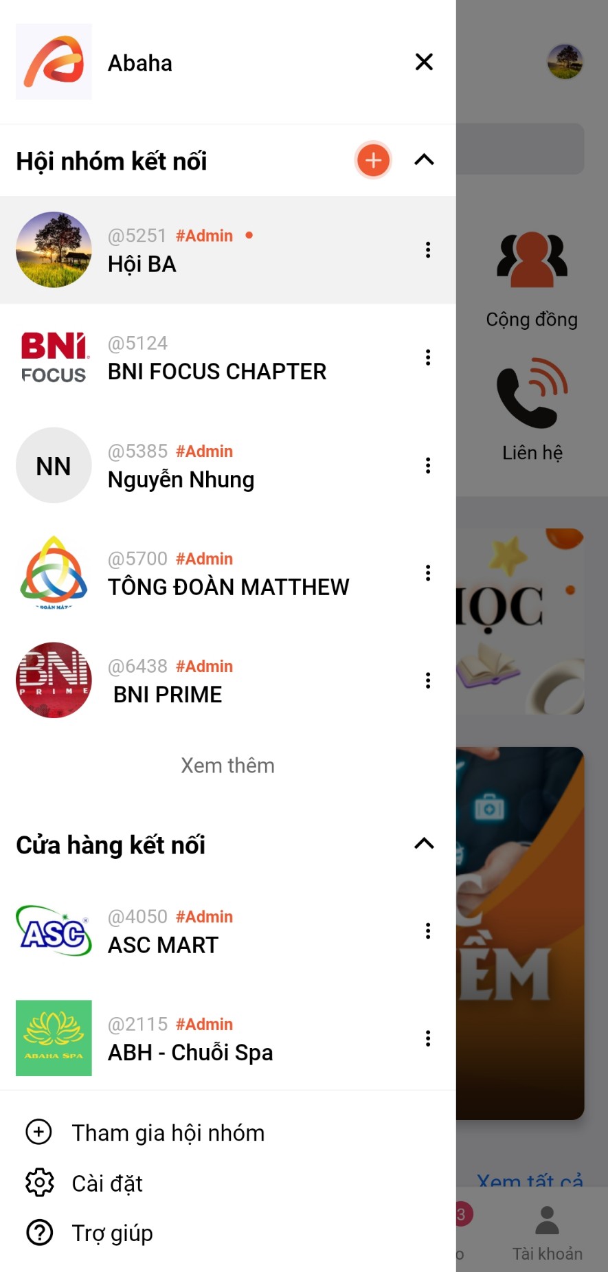 Cách 1: Tại trang chủ chọn menu 3 gạch nằm tại góc trái màn hình. Sau khi ấn màn hình mở ra modal hiển thị các Hội nhóm của bạn và các doanh nghiệp bạn đã thăm quan gần đây. Bạn có thể chọn truy cập 1 hội nhóm hoặc 1 doanh nghiệp trong danh sách.