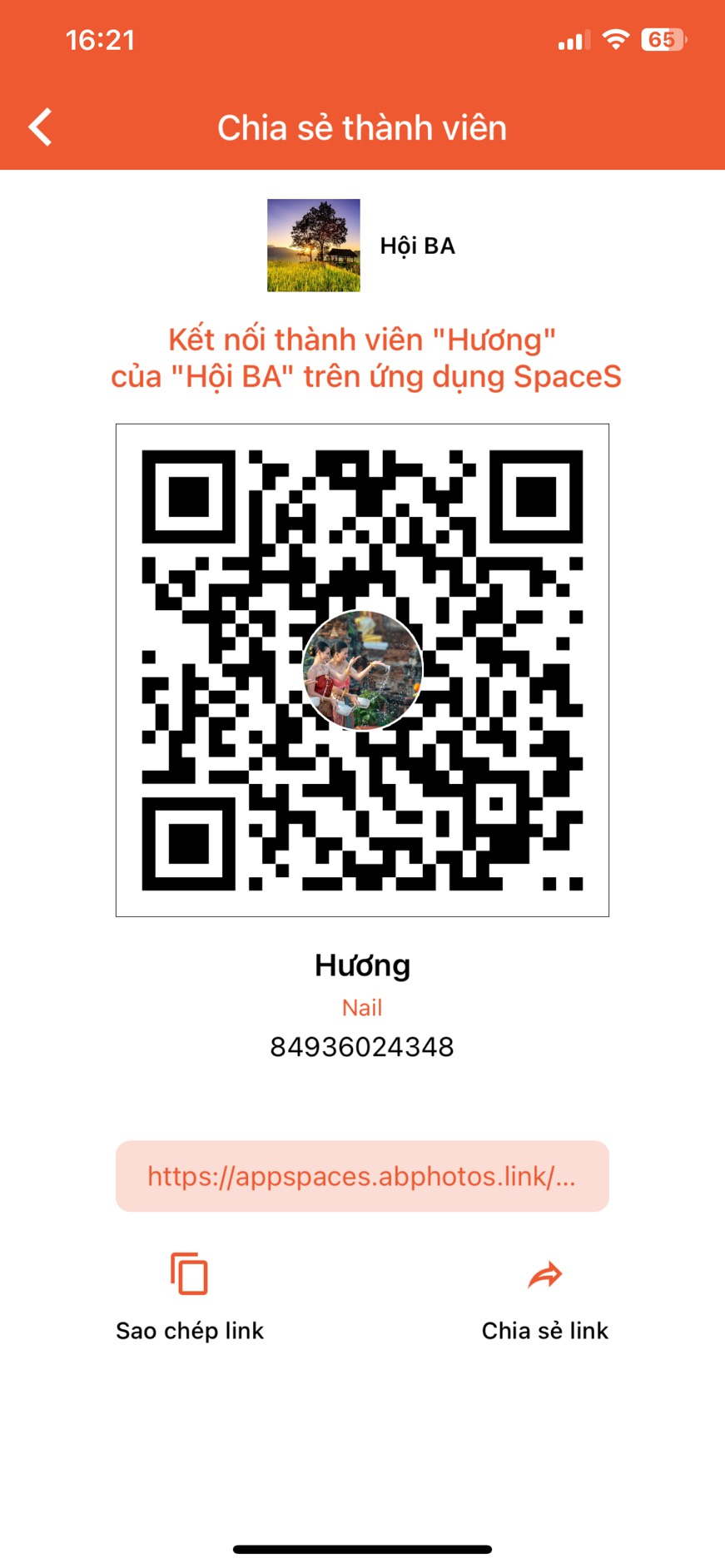 Sau khi ấn "Chia sẻ", màn hình hiển thị trang chia sẻ thành viên bao gồm mã QR profile và link profile.