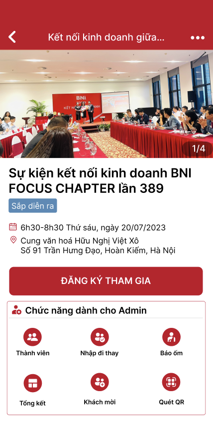 Với sự kiện "Sắp diễn ra" nút hành động sẽ là "Đăng ký tham gia".Khi người dùng ấn tham gia, hệ thống sẽ ghi nhận người dùng đó vào danh sách đăng ký tham gia sự kiện. Từ đó, ban tổ chức sự kiện có thể gọi điện đến những người có trong danh sách để xác nhận về sự chắc chắn tham gia sự kiện.