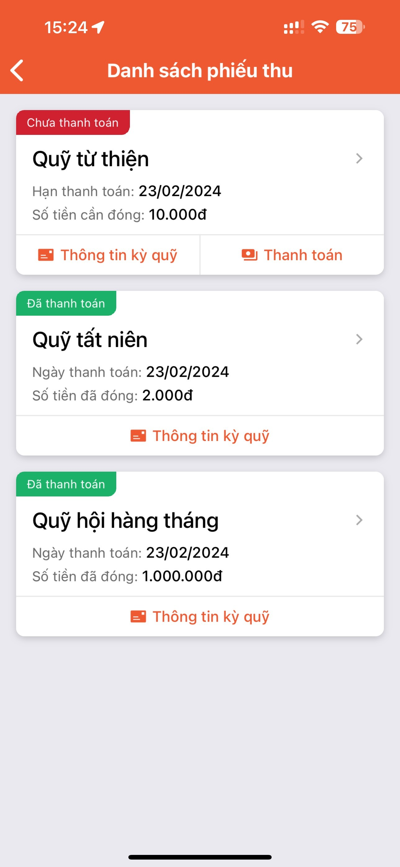 Thành viên có thể truy cập vào danh sách phiếu thu từ 2 chỗ trong trang chủ