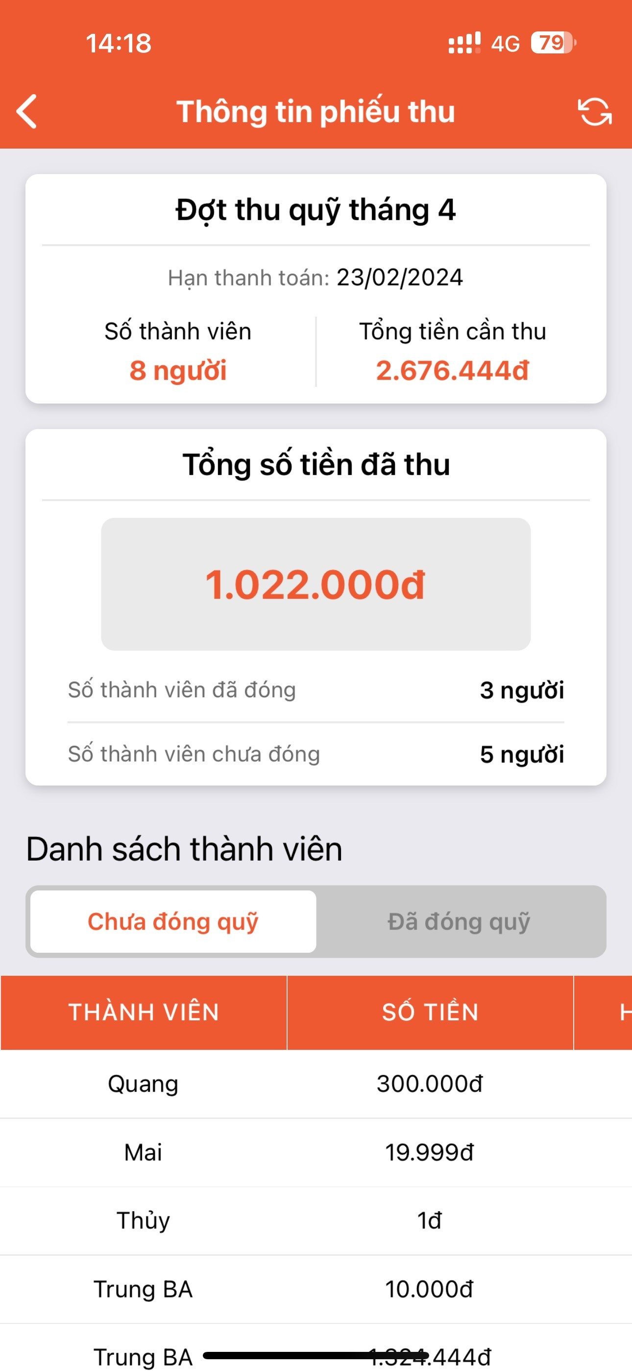 Trong "Danh sách thành viên " sẽ có 2 tab "Chưa đóng" và "Đã đóng"Chưa đóng sẽ có các thông tin