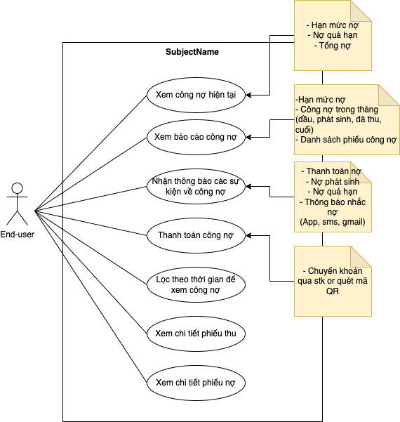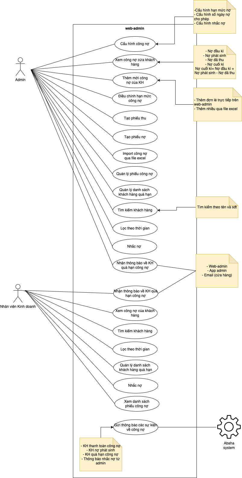 <table data-header-hidden><thead><tr><th width="93"></th><th></th></tr></thead><tbody><tr><td><strong>STT</strong></td><td>Tính năng</td></tr><tr><td>1</td><td>Cài đặt được hạn mức công nợ của khách hàng để kiểm soát hạn mức khách hàng mua nợ hàng hoá.</td></tr><tr><td>2</td><td>Hiển thị được tổng số nợ để tôi biết số tiền nợ cần phải thu của tất cả khách hàng.</td></tr><tr><td>3</td><td>Hiển thị chi tiết số nợ của từng khách hàng để tôi có thể theo dõi và biết số nợ cần phải thu của từng khách hàng.</td></tr><tr><td>4</td><td>Theo dõi được các khách hàng đang quá hạn nợ, để nhắc nợ khách hàng.</td></tr><tr><td>5</td><td>Điều chỉnh hạn mức công nợ của một số khách hàng, vì một số khách hàng VIP có chính sách đãi ngộ riêng.</td></tr><tr><td>6</td><td>Hỗ trợ kinh doanh nhắc nợ để thúc giục khách hàng thanh toán công nợ.</td></tr><tr><td>7</td><td>Quản lý được các phiếu công nợ của tất cả khách hàng.</td></tr><tr><td>8</td><td>Nhận thông báo về các khách hàng đã quá hạn mức công nợ để xem xét điều chỉnh hạn mức của khách hàng.</td></tr><tr><td>9</td><td>Theo dõi được công nợ của khách hàng để nhắc khách hàng thanh toán công nợ</td></tr><tr><td>10</td><td>Thông báo về những khách hàng đã quá hạn để nhắc nhở khách hàng thanh toán công nợ</td></tr><tr><td>11</td><td>Giúp đại lý xem được số nợ của mình hiện tại, để theo dõi và biết được cần phải trả bao nhiêu tiền cho chủ doanh nghiệp</td></tr><tr><td>12</td><td>Giúp đại lý xem được lịch sử công nợ của mình bao gồm, thanh toán nợ và phát sinh thêm nợ để có thể theo dõi và đối soát.</td></tr><tr><td>13</td><td>Giúp đại lý nhận được thông báo về công nợ bao gồm: Thanh toán, phát sinh và quá hạn để có thể theo dõi và đối soát.</td></tr><tr><td>14</td><td>Giúp đại lý xem chi tiết phiếu thu bao gồm số tiền và các mã phiếu đã thanh toán để đối soát thông tin.</td></tr><tr><td>15</td><td>Giúp đại lý xem chi tiết phiếu nợ bao gồm số tiền và các đơn hàng để đối soát thông tin.</td></tr></tbody></table>