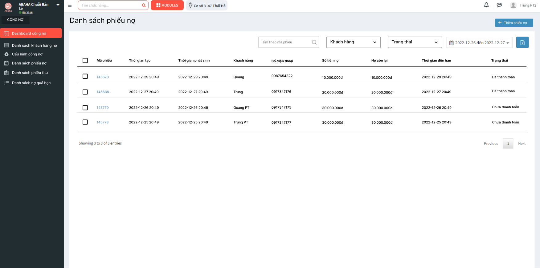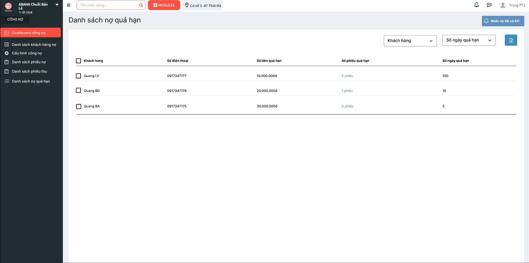 Tại trang danh sách nợ quá hạn, sẽ hiển thị các thông tin sau:Danh sách phiếu nợ quá hạn hiển thị theo tăng dần ID phiếu