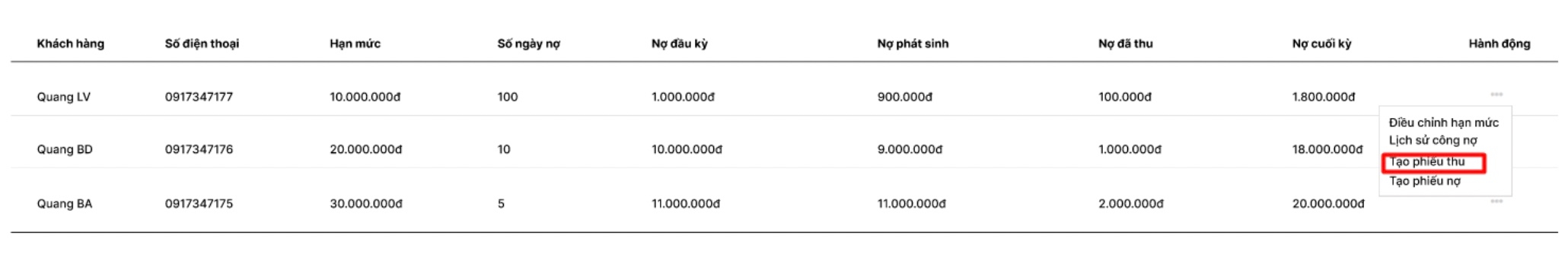 Nhấn vào phần 3 chấm trong hành động và chọn tạo phiếu thu