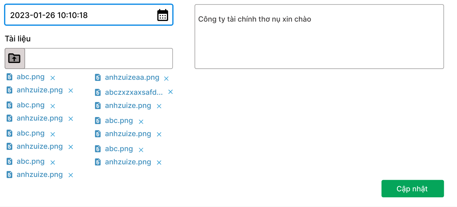 Tài liệu : (Khách hàng có thể up hóa đơn,... ) lên chỉ nhận ảnh và có thể up nhiều ảnh tối đa 15 file và dung lượng 5MB