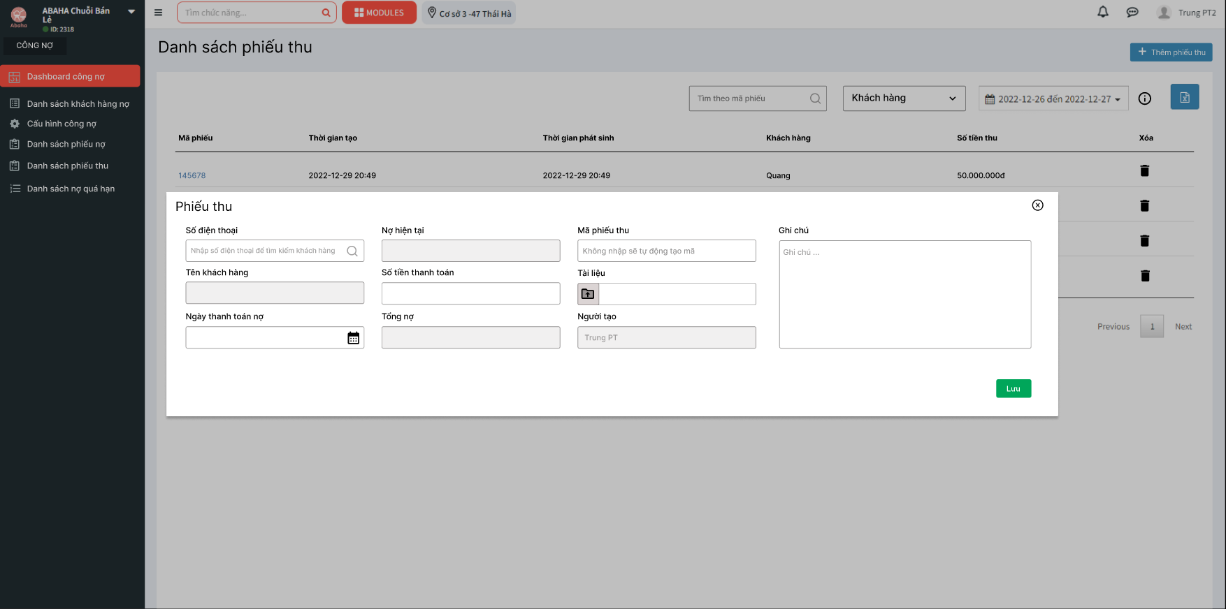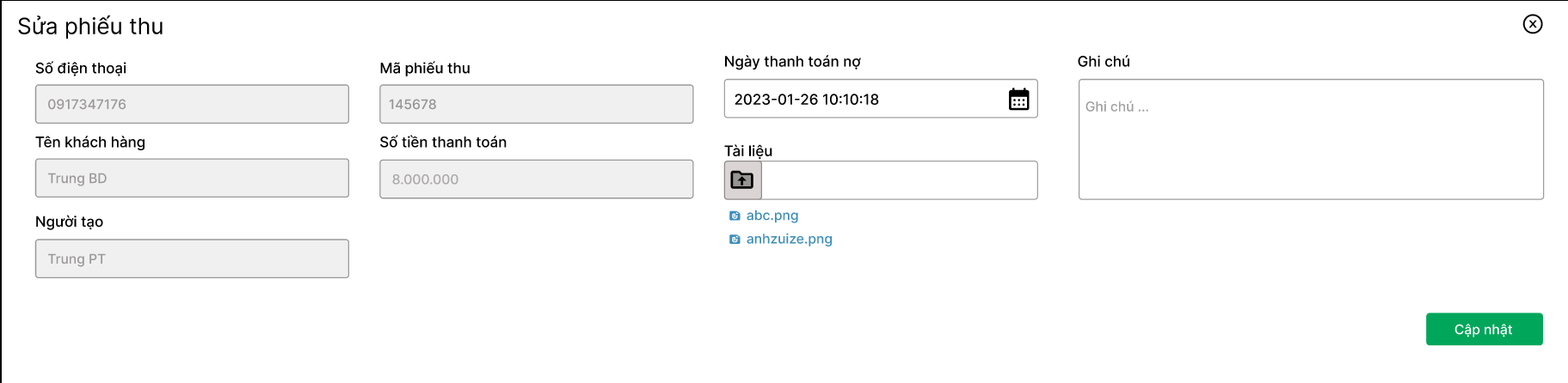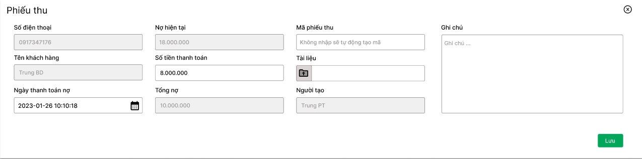 - Tạo phiếu thu: Tạo mới phiếu thu (thanh toán nợ)