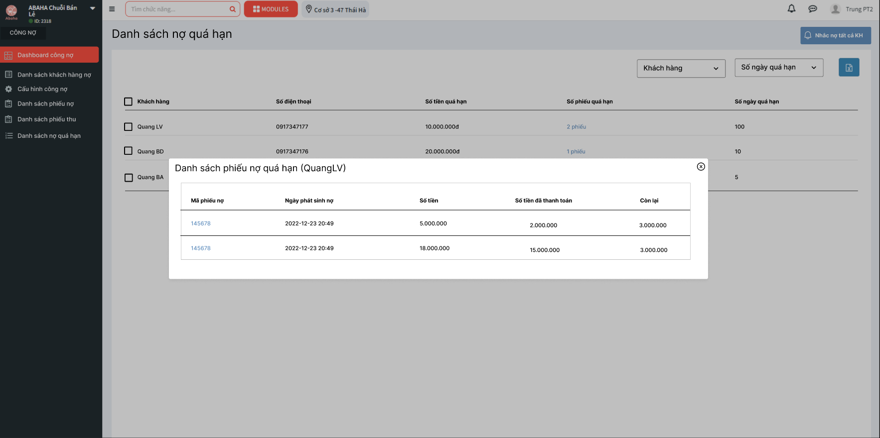 - Chi tiết công nợ: Xem chi tiết công nợ của khách hàng