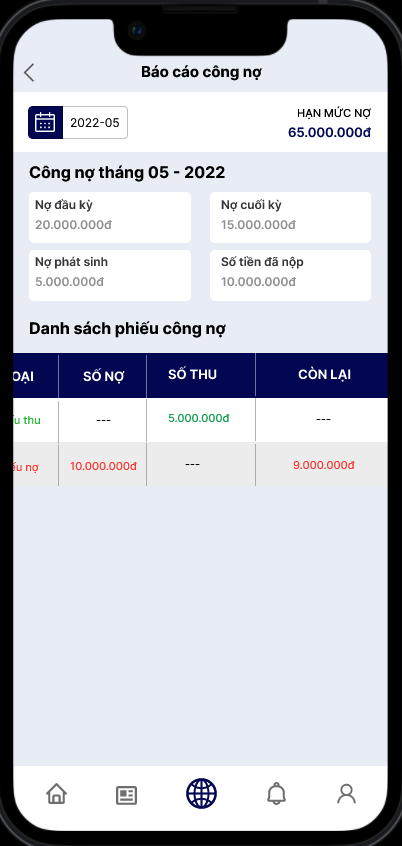 Khách hàng có thể lọc theo tháng để xem số liệu về công nợ bao gồm