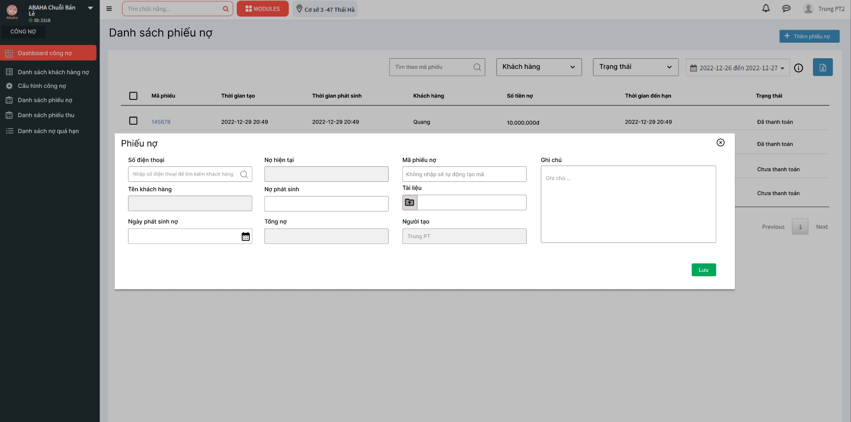 - Tạo phiếu nợ: Tạo mới phiếu nợ (nợ phát sinh)