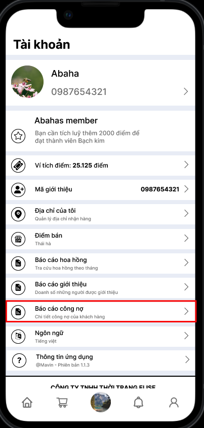 Tại tab Tài khoản trên App có thêm menu Báo cáo công nợ.Tại tab này khách hàng sẽ không hiển thị menu Báo cáo công nợ khi site không bật key "Hiển thị công nợ trên app" (tại màn hình cấu hình công nợ)