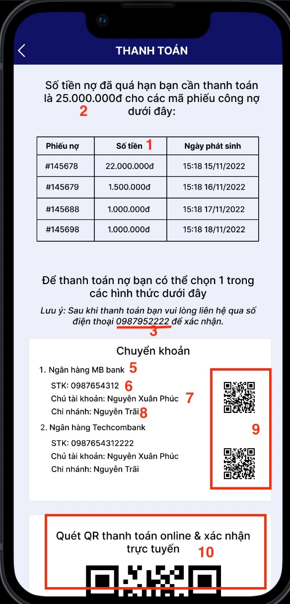 Khi ấn vào thông báo nhắc thanh toán nợ, màn hình sẽ chuyển sang trang thông tin thanh toán