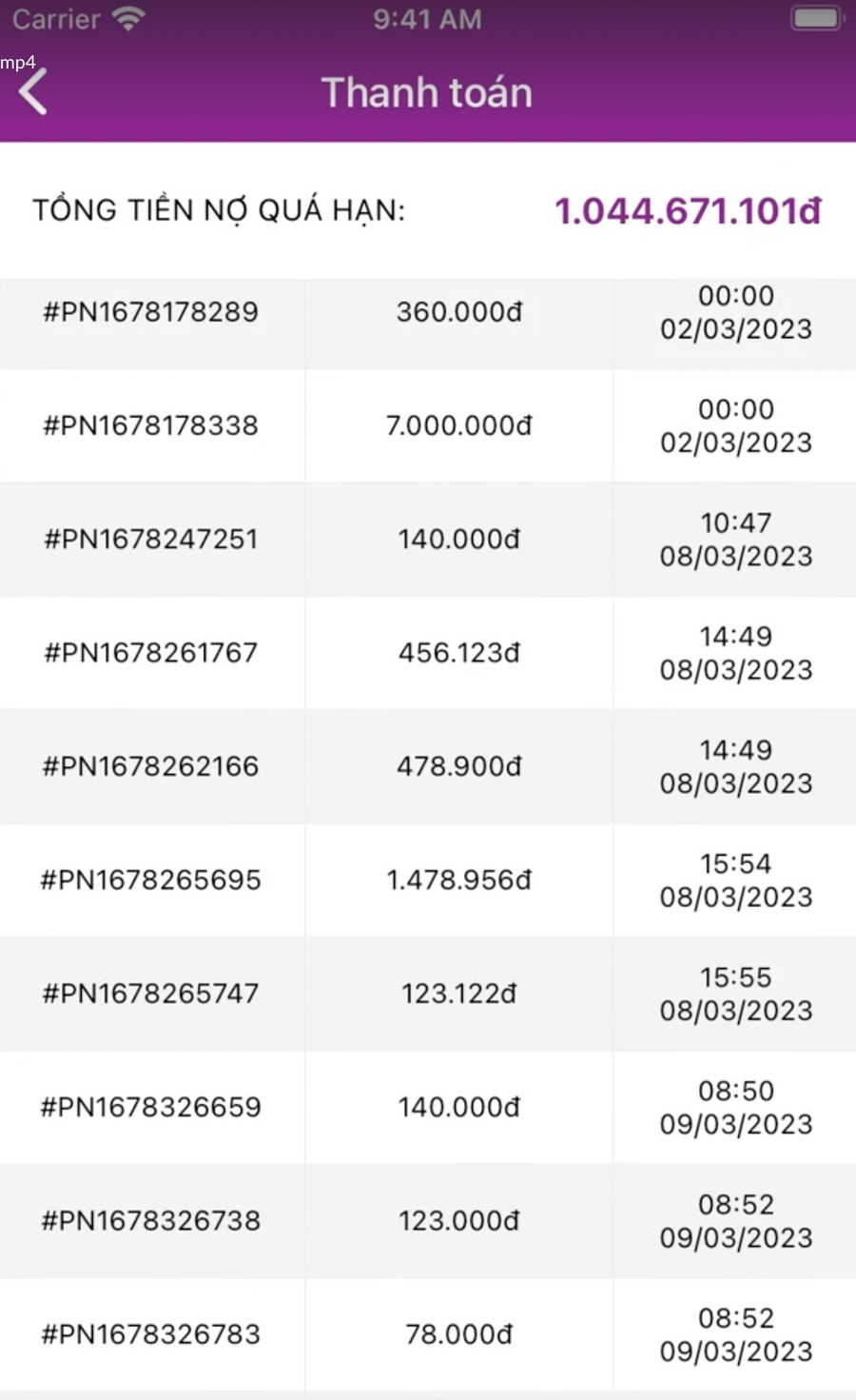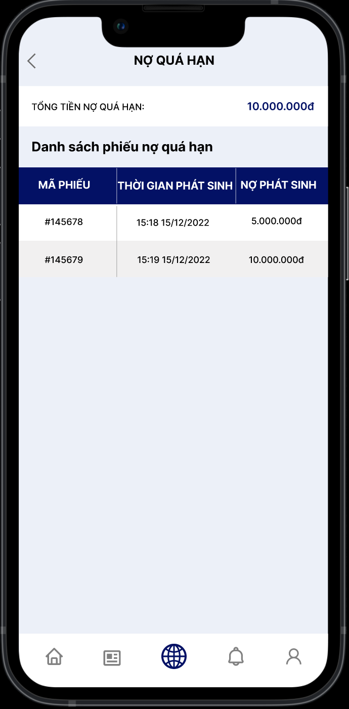 Khi ấn vào ô nợ quá hạn tại trang chủ, màn hình sẽ chuyển sang màn hình Nợ quá hạn.
