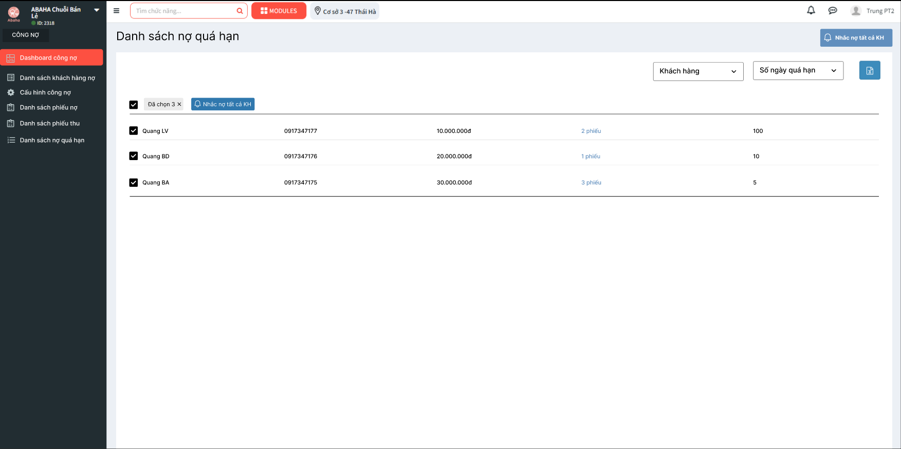 Admin cũng có thể chọn 1 vài khách hàng để nhắc nợ bằng cách tích chọn vào từng khách hàng. Nhắc nợ quá hạn sẽ gửi thông báo qua App tới khách hàng đó