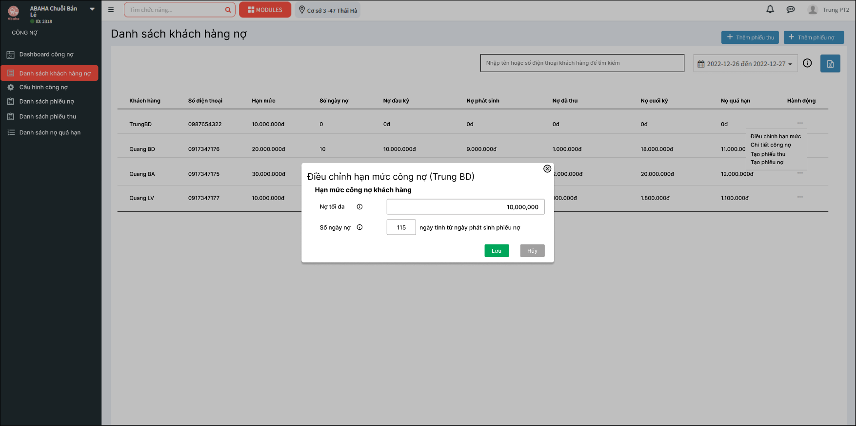 Nhấn vào phần 3 chấm trong hành động và chọn tạo phiếu nợ. Sau khi chọn sẽ hiển thị ra popup.