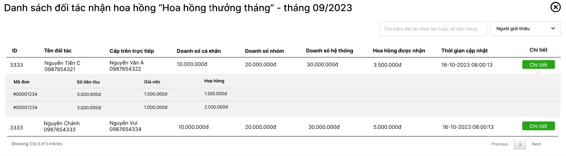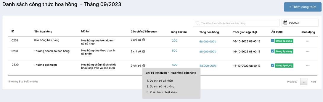 Cách truy cập: Click vào cột Tổng đối tác hoặc Tổng hoa hồng tại trang Danh sách công thức hoa hồng