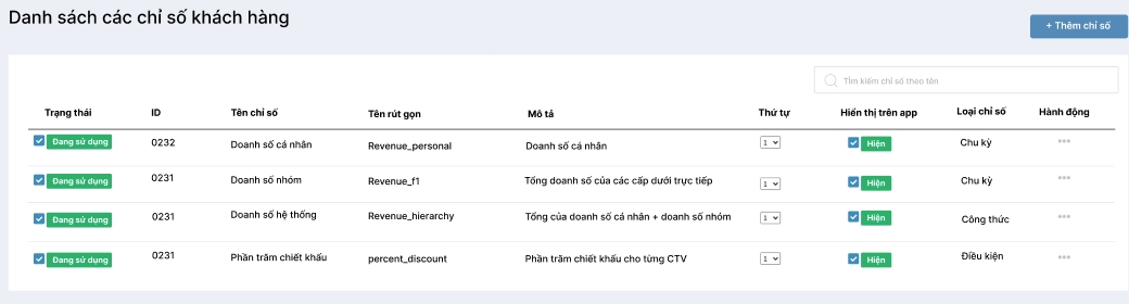 Thông báo: Chỉ dành cho các chỉ số gửi thông báo tới khách hàng trong 1 điều kiện cụ thể. Ví dụ: Doanh số cá nhân < doanh số duy trì cấp => gửi cảnh báo giữ cấp tới khách hàng với nội dung "Bạn cần X doanh số để giữ cấp đại lý Y"