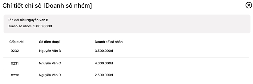doanh_so_nhom: Là một chỉ số được tính dựa vào tổng doanh số cấp dưới trực tiếp được CTV giới thiệu ra.