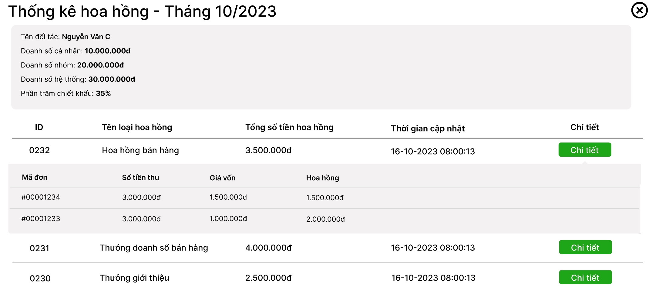 Để theo dõi chi tiết hơn về số hoa hồng của đối tác, admin click vào button [Chi tiết] nằm tại cột Chi tiết hoa hồng. Màn hình sẽ xổ xuống chi tiết số hoa hồng của user đó nhận được tương ứng với từng cấp dưới của họ. (Các thông số chi tiết này có thể thay đổi được bằng việc chọn chỉ số xem chi tiết ở từng công thức hoa hồng)