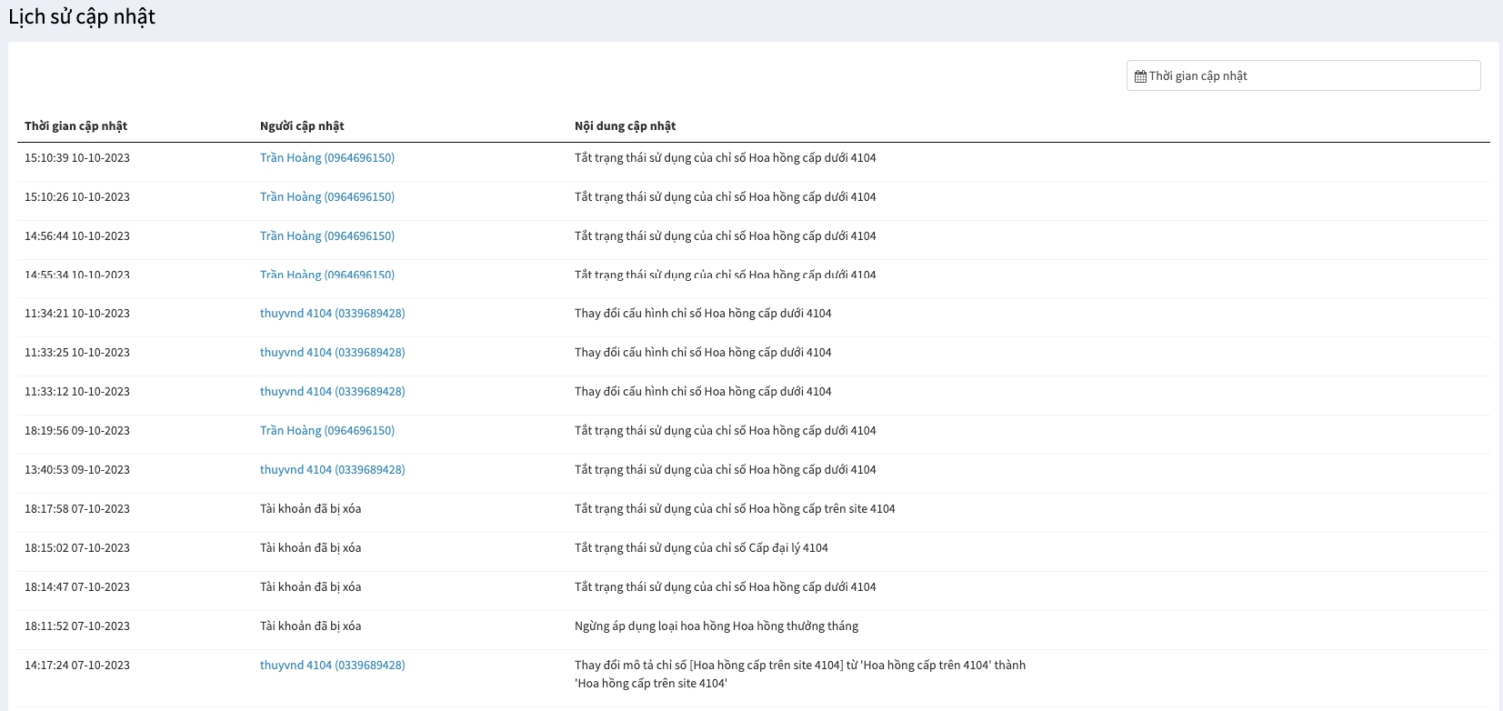 Lịch sử cập nhật giúp admin theo dõi tất cả những thay đổi quan trọng liên quan đến mô hình hoa hồng và các chỉ số của cửa hàng. Qua đó khi xảy ra sự cố, admin có thể chủ động kiểm tra và truy xuất người đã gây ra thay đổi.
