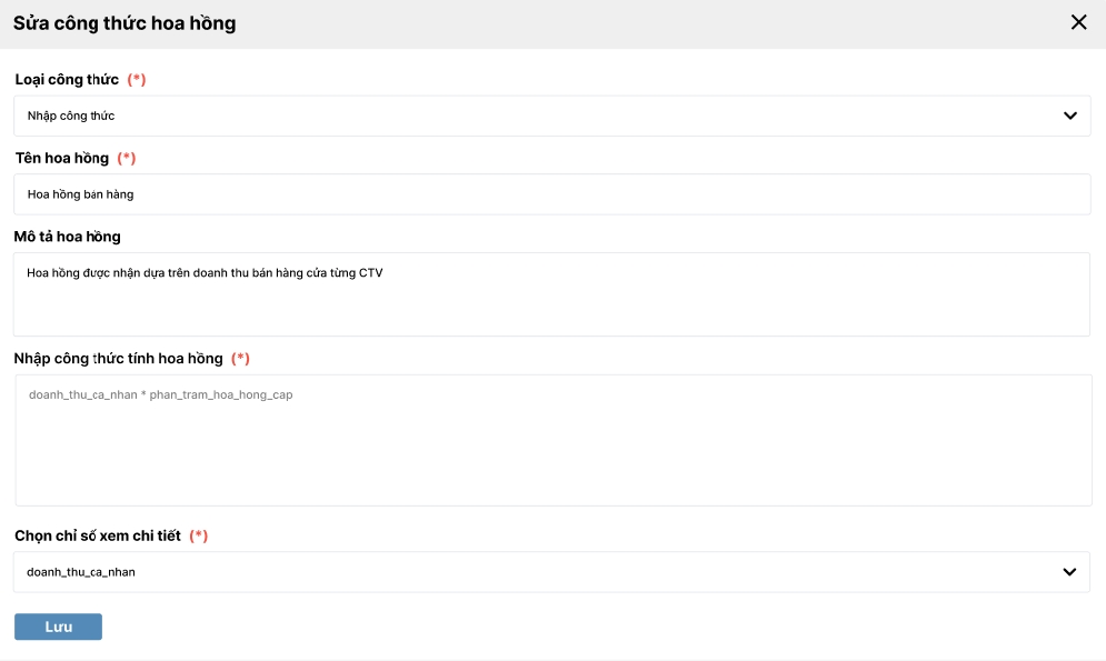 Admin thực hiện thay đổi nội dung cần chỉnh sửa trong popup Sửa công thức hoa hồng. Sau khi thực hiện chỉnh sửa, click lưu để hệ thống lưu trữ thông tin và cập nhật dữ liệu mới.