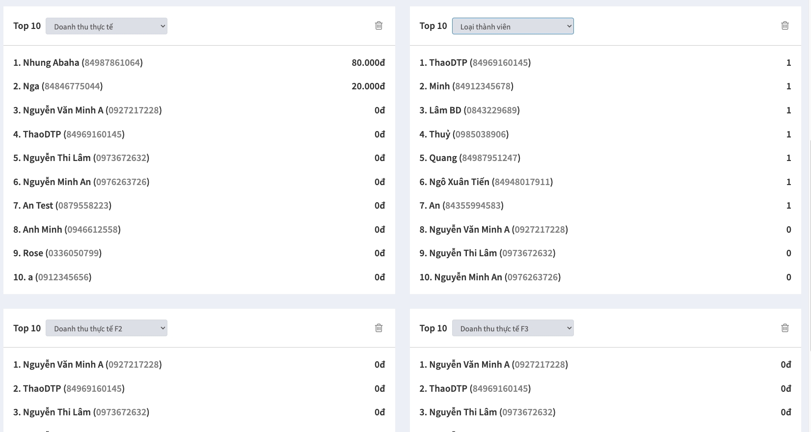 Đặc biệt hệ thống cung cấp 4 bảng thống kê top 10, admin có thể tuỳ chỉnh và lựa chọn ra 4 bảng thống kê top 10 các số liệu được ưu tiên nhất.