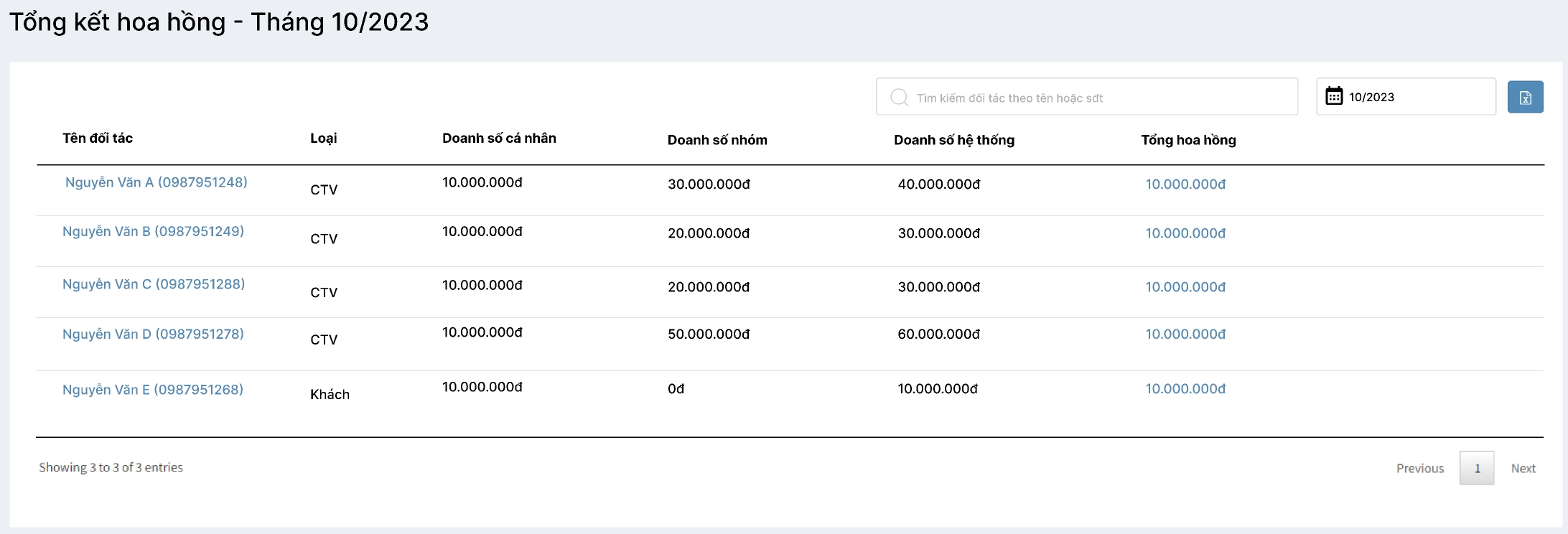 Đối tác: Tên + SĐT của đối tác (Click mở popup 4.1 Thống kê hoa hồng theo từng đối tác, xem hướng dẫn tại mục 4.1)
