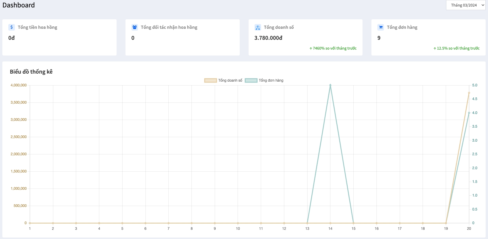 Thời gian cập nhật: Thời gian cuối cùng cập nhật số liệu tổng hoa hồng và tổng đối tác trong tháng được lọc.