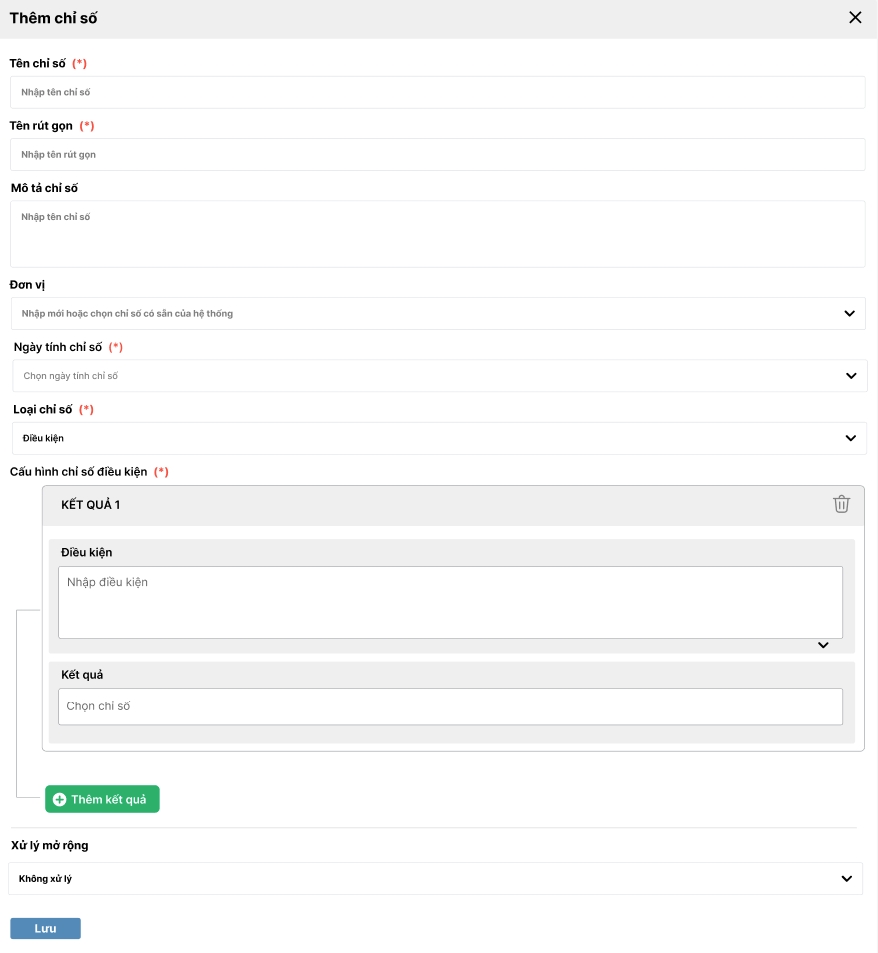 Xử lý mở rộng: Hàm xử lý mở rộng, chỉ chọn khi tạo một chỉ số có thực hiện một hành động cụ thể. Hàm xử lý mở rộng sẽ được chạy sau khi tính ra giá trị của chỉ số.
