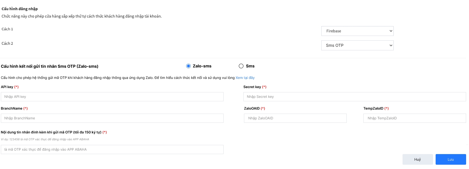 Chức năng này cho phép cửa hàng cấu hình kết nối phương thức SMS OTP.