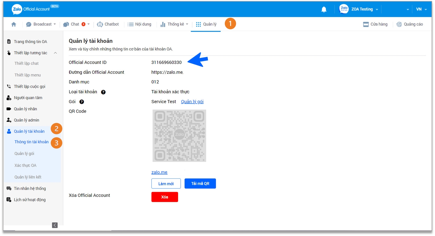 Mã id của tài khoản ZaloOA của bạn. OA ID là 1 dãy số định danh mỗi OA và là duy nhất không trùng với bất kỳ OA nào. OA ID này có thể được tìm thấy ở: