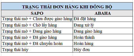 * Đồng bộ đơn đặt hàng và khách hàng liên hệ với Abaha để cài đặt tự động. Đơn hàng Abaha đang đồng bộ đơn đặt hàng cả 2 chiều giữa Abaha và Sapo Web/ Sapo Omni.