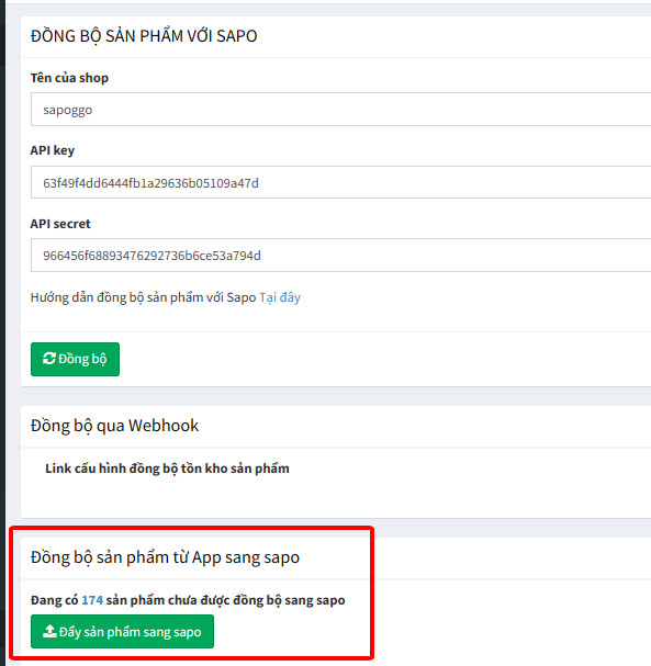 Thông tin kết nối Api (được thiết lập trên hệ thống quản lý trên Sapo Web).