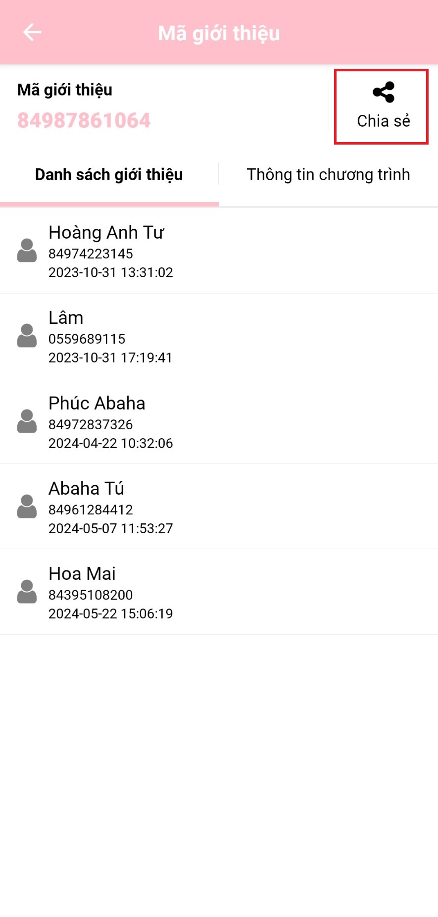 Bước 3: Click **“Chia sẻ”** mã giới thiệu.