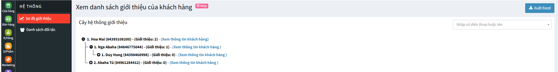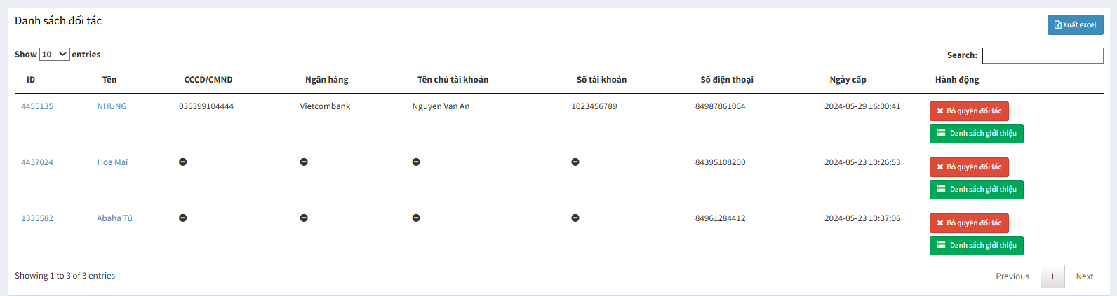Màn hình lúc này sẽ hiển thị Danh sách các khách hàng do đối tác đó giới thiệu ra.